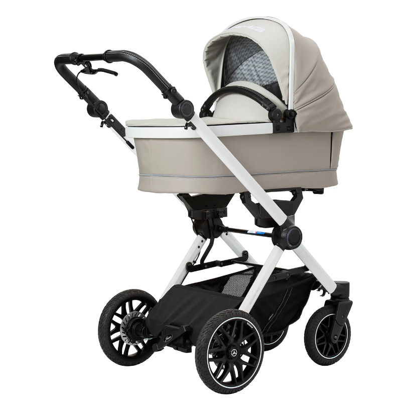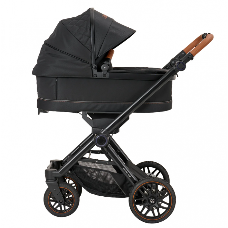 Люлька декорирована фирменными элементами, цветной строчкой и логотипом AMG. Просторная колыбель создает комфортные условия для первых месяцев беззаботного сна младенца. В обшивке коляски используются ткани Dinamica, отвечающие высоким требованиям качества линейки автомобилей AMG. На дне детской колыбели постелен нежный и дышащий матрас Softline. Каркас люльки, ее визуальный дизайн - разработаны специалистами компании Mercedes-Benz, а потому все в ней идеально для новорожденного ребенка. Периметр корпуса обрамлен прочным алюминиевым каркасом цвета рамы коляски. Большая Premium колыбель для малыша оснащена спинкой с регулировкой положения по наклону и накидкой изолирующей салон от ветра или дождя. Плавно регулируемая климатическая зона, состоящая из отсеков в основании корпуса, обеспечивает оптимальную циркуляцию воздуха и приятный микроклимат летом и зимой. У основания капюшона расположена массивная ручка для удобной переноски. Капюшон люльки складывается автоматически с помощью нажатия кнопки. На капюшоне есть защитный козырек, а в центре расположен отсек для наблюдения за малышом.