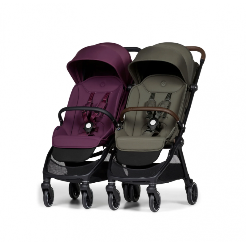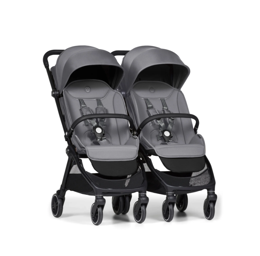 Единственная в мире коляска для двойни, которая соответствует габаритам ручной клади IATA складывается автоматически и помещается на полку в самолете или стоит самостоятельно, как багаж. Конструкция легко складывается с адаптерами или бампером в любой момент путешествия. Плавная тормозная система срабатывает в одно касание ноги. Полноприводная амортизация обеспечивает мягкий ход двух колясок одновременно. Вместительные корзины под каждым сиденьем позволяют взять с собой любимые игрушки или средства гигиены. Уникальная модульная система с магнитным креплением позволяет возить в колясках двоих, троих детей, в любой момент разъединять или соединять шасси, планируя прогулку по своему желанию.