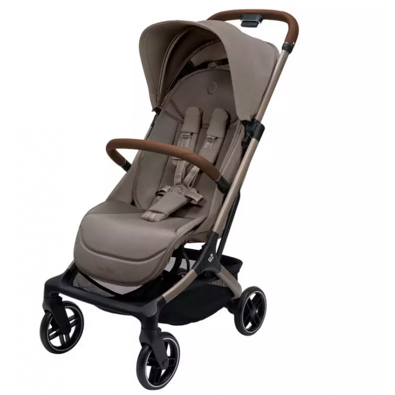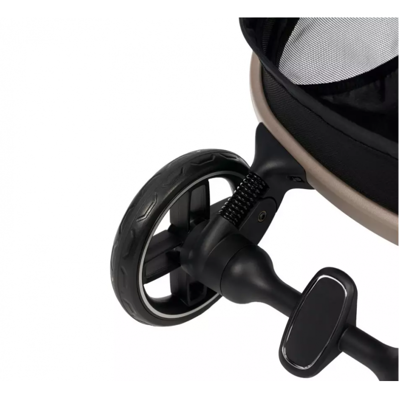 Амортизационная система колес обеспечивает мягкость хода на различных дорогах, а поворотные передние колеса позволяют легко управлять коляской на поворотах. Вместительная корзина для покупок выдерживает нагрузку до 5 килограмм, размещая необходимые вещи. Интуитивно понятная тормозная система срабатывает в одно касание и помогает контролировать поездку.